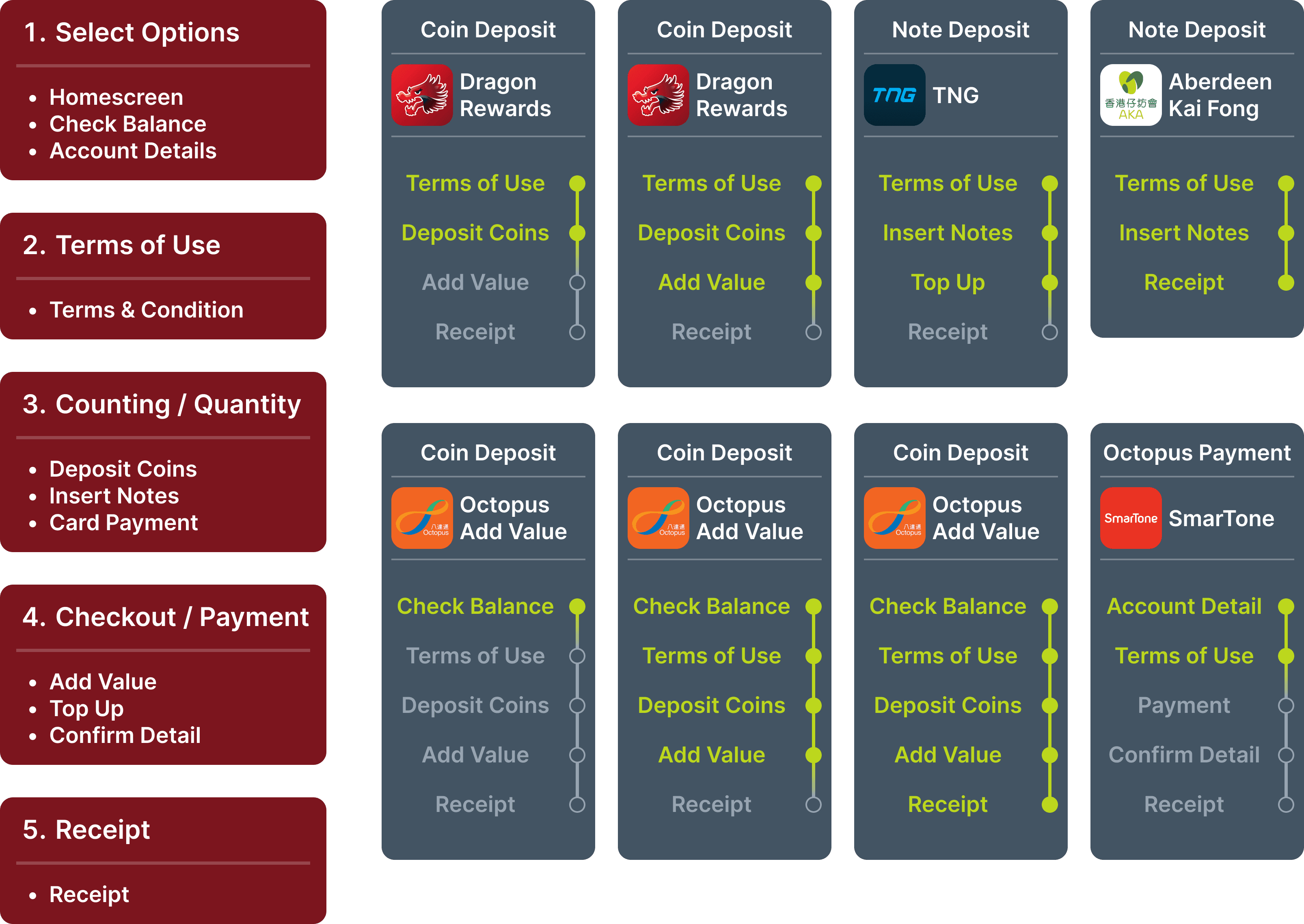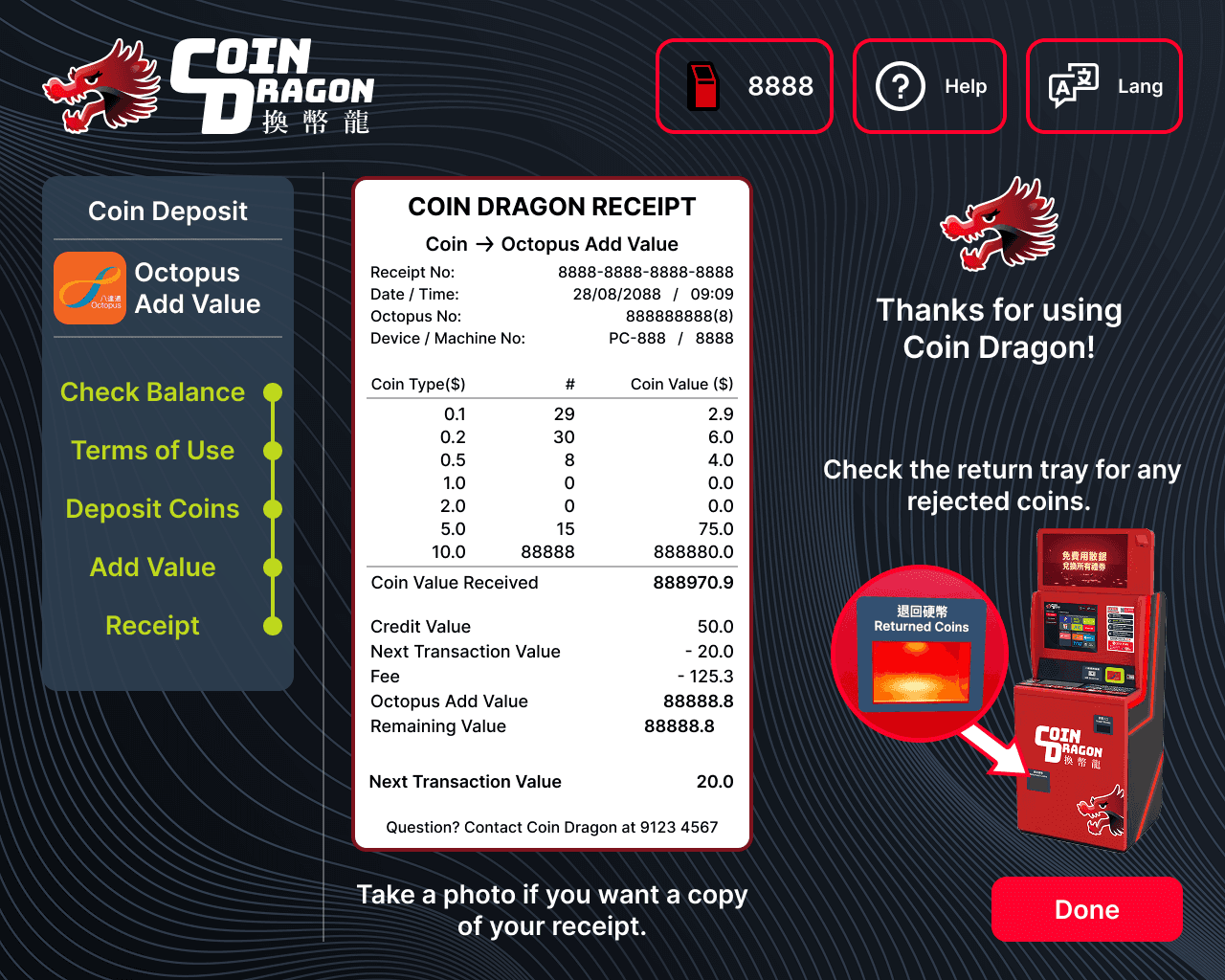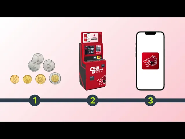 Coin Dragon operates deposit kiosk machine that accepts local coins and banknotes. The total sum would be deposited into the user’s choice of payment (such as bank account, transport card, retail vouchers, donation or bill payment).